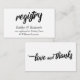Ces inserts élégants de cartes de détail ont été conçus pour correspondre à d'autres éléments dans une suite de mariage et d'événements en croissance qui présente un design simple noir sur blanc. Sur le devant, vous lisez "registre" dans un script audacieux et moderne, une police manuscrite ; sur le dos, j'ai placé un graphique magnifiquement rendu des mots "amour et merci". Tout type modifiable est rendu dans une police serif polyvalente. Il suffit d'utiliser les champs modèles et de remplacer mon texte de remplissage par vos propres détails personnels pour faire de ces cartes votre propre. L'arrière - plan peut être changé en n'importe quelle couleur de votre palette mariage que vous préférez. N'hésitez pas à me contacter si vous avez des demandes spéciales ou avez besoin d'autres articles. Je suis également heureux de vous aider à personnaliser ces cartes si vous en avez besoin. // 89 // Conçu par Melody Watson pour Paper Muserie