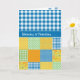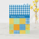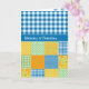 Une carte de grand-parents avec "Joyeuse Fête des grands-parents" en gallois avec un Faux Patchwork de motifs de la jonquille en équipe avec En vichy de chèques bleus et blancs.