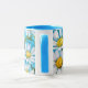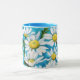 This floral mug features a daisy flower pattern, which I processed with an oil pastel painterly style for an artsy flair. The handle and inside of the cup are aqua blue to complement the artwork.
