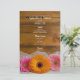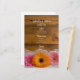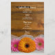 Customisez le charmant Daisy Trio Country Barn Mariage Menu avec les détails du repas que vous pourrez servir à votre déjeuner de douche nuptiale décontracté mais classe, dîner de réception de mariage ou brunch post mariage. Il peut être personnalisé avec le nom de la mariée et du marié, l'emplacement du lieu et la date de l'événement. Ce menu mariage à thème de ranch chic rustique propose une photographie florale surannée de deux marguerites roses et d'une marguerite orange, un voile de mariée blanc et un arrière - plan en bois de grange patiné brun. Idéal pour organiser votre événement de célébration à la ferme.