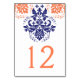 Elégant motif damassé bleu marine, corail orange mariage numéro de table carte place. Un design mariage moderne mais classique avec une touche rétro. Un design mariage délicat et vintage, parfait pour un mariage de printemps ou d'été contemporain ou traditionnel.