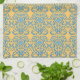 Cette serviette de cuisine a un élément damassé / motif, créé par Kristie Hubler, répété, dans un bleu d'oeuf rouge / bleu océan / bleu aqua, avec un citrouille jaune clair / italien / arrière - plan de couleur or méditerranéenne. Vieux monde.