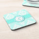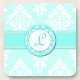 Jolis dessous de verre de monogramme, avec une aigue-marine légère et un arrière - plan blanc de damassé. Une rayure bleu vert audacieuse fonctionne à travers le milieu, avec un disque rond décoratif, au milieu, pour un monogramme d'une lettre. Personnalisez l'initiale pour adapter à vos besoins. Grande idée de cadeau.