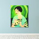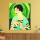 Toile dans un portrait Art Déco moderne semi-abstrait d'une dame en kimono, tenant un ventilateur, contre un arrière - plan abstrait vert jade