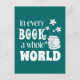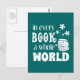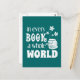 Ce dessin dit "Dans chaque livre Un monde entier" et est accompagné d'une pile de livres avec des fleurs qui en poussent. C'est un design magnifique, parfait pour les gens qui aiment se perdre dans un bon livre. Carte postale de bonne qualité, c'est aussi une excellente façon de parler aux gens des nouveaux événements du livre, des clubs de lecture et des lancements de livres.