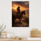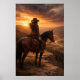 Un cavalier solitaire s'arrête à cheval, dominant une vallée vaste tandis que la lumière dorée perce à travers des nuages dramatiques du soir. Ce paysage western paisible capture un moment de réflexion et de liberté dans les grands espaces ouverts.