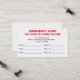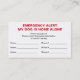 Ce carte de visite est imprimé avec l'alerte de secours des textes : Mon chien est seul à la maison. Il fournit un endroit pour ajouter des noms du contact ou des numéros de téléphone de personnes qui s'inquiéteront de votre chien si vous êtes blessés ou frappés d'incapacité. La carte est conçue pour être portée dedans votre portefeuille et peut être customisée en complétant les noms et les numéros de téléphone. Elle est parfaite pour que le propriétaire de chien prévoie en avant dans ainsi le personnel de secours satisfera à vos souhaits.