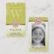 Le joint en service de familles roses avec floral sur le ruban vert et blanc d'arrière - plan et d'or équilibrent. Initiale, noms, numéro de téléphone et email customisés.