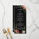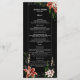 This menu design combines elegance with a dark, captivating aesthetic, perfect for a refined, moody event. Set against a deep black background, the text is beautifully contrasted with delicate white and soft floral accents in rich hues of blush and peach, framed by lush green foliage. The layout is clean and sophisticated, guiding guests through each course in a way that’s easy to read and visually pleasing. This menu is ideal for weddings or formal gatherings that embrace a dark, romantic vibe, adding an extra layer of beauty and elegance to your table setting.
