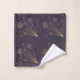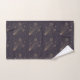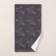 Dark purple towels and a washcloth feature a delicate pattern of golden shooting stars. The towel set is neatly arranged on a metallic rack.