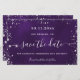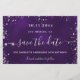 Une carte Save the Date glamour pour une fête d'anniversaire de 50e (ou tout âge). Un arrière - plan violet de couleur inégale. Décoré avec de la poussière de parties scintillant en faux argent. Le texte : Save the Date est écrit avec un grand script de style à la main tendance.