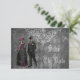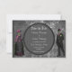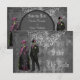 Cartes de save the date de mariage Halloween, fraîches et effrayantes, avec une fantastique mariée et un marié squelettes gothiques horrifiques. La mariée est vêtue d'une belle robe de mariée vintage noire, rose et verte avec des fleurs et des ornements de papillons. Le marié est élégant dans son haut-de-forme, sa queue-de-pie et sa canne. Le fond est un élégant collage gothique vintage chic délabré noir, gris et blanc avec des décorations de volutes blanches ornées, une libellule, une écriture antique délavée et un motif de harlequin stylisé. Au verso de ces invitations gothiques branchées se trouve un sous-main glamour imprimé de perles noires et de dentelle avec du texte que vous pouvez personnaliser avec les détails de votre événement. Invitations amusantes, classe et tendance. J'ai des produits assortis dans ma boutique. Tout le texte peut être facilement personnalisé pour répondre à vos besoins et vous pouvez changer le style, la couleur et la taille de la police si vous le souhaitez. Si vous avez besoin d'aide pour personnaliser votre produit, ve