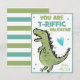 Les cartes de jour pour les enfants Dinosaur Valentines, parfaites pour les distribuer à des camarades de classe et des amis. Disponible avec ou sans enveloppes. Ce design mignon a un T-Rex Dino en vert et blues et avec You Are T-Riffic Valentine, vous pouvez personnaliser le nom. Le dos est une jolie bande verte et bleue assortie.