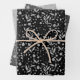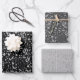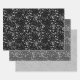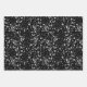Un joli trio de feuilles de papier d'emballage comporte une couche motif de feuille en parties scintillant argentée avec des arrière - plans noirs, gris foncé et gris clair.