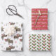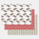 Belle et moderne feuilles de papier d'emballage avec trois motifs différents, le premier avec quelques mignons rennes de dessin avec des flocons rouges et verts sur un arrière - plan blanc; le deuxième feuille est rouge, avec le libellé Happy Holidays en blanc et vert tous les casquettes lettrés; le troisième en blanc avec un saint motif feuille vert et rouge.