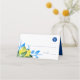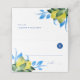 Cartes de mariage toscane avec choix de repas design dispose d'une arête de mes citrons originaux aquarellés en jaune vif avec des botaniques bleus et verts. Espace prévu pour le nom du client, le numéro de table et le choix initial du repas : (v) vegan, (c) poulet, (b) boeuf ou (gf) sans gluten. Les cartes sont inversées pour révéler les noms de mariée et de mariée correspondants et la date du mariage. L'intérieur est décoré d'une couleur bleu uni. Conçu pour correspondre au thème Mariage italien Do Tell a Belle. Parfait pour les mariages toscans et de destination méditerranéens. Pour voir le décor de table en citron assorti, visitez www.zazzle.com/dotellabelle Art et design de Victoria Grigaliunas
