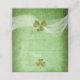 Carte d’escorte pliée mariage de la Saint Patrick, verte au trèfle et au voile, ornée d’une feuille shamrock verte avec contour doré sur un voile blanc ondulé sur un arrière - plan coloré vert grunge.