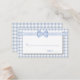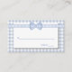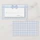 Sweet country chic mariage escort place cartes, faites dans un bleu clair et blanc à damiers en vichy motif, avec une zone de texte blanche. Les graphiques d'un ruban en vichy bleu clair et blanc et d'un arc s'étirent sur le dessus. Produits mariages correspondants disponibles.