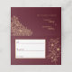Cette carte de mariage à fleurs d'or bordeaux présente un somptueux décor de merlot foncé avec d'élégantes calligraphies dorées et des ornements floraux dorés. L'histoire des couleurs de bijoux et les accents botaniques dorés ainsi qu'un écriture minimaliste et délicate créent une esthétique moderne, royale et romantique, qui établit un équilibre parfait entre le vintage classique et le décontracté contemporain, ce qui en fait un choix facile pour une variété variée de mariages et d'événements. Comme pour tous nos designs, si vous avez des questions ou des demandes spéciales de coordination de produits, veuillez nous contacter.