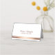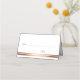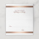 Une élégante carte rose or/cuivre ornée d'une simple carte blanche mariage avec les noms de la mariée et du marié sur le dos et leur date de mariage.