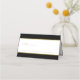 Un élégant noir et blanc avec une carte de place de table de garniture d'or avec les noms de mariée et de mariée et leur date de mariage sur le dos.
