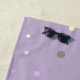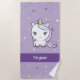 Une serviette de plage violette avec une mignonne licorne en couleur pastel, un prénom personnalisable et un arrière - plan pois : un cadeau sympathique pour une ado qui veut aller à la plage !