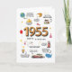 Faites un voyage nostalgique en 1955 avec cette carte d'anniversaire ! Ce n’est pas seulement une carte, c’est comme une capsule temporelle remplie de faits amusants de l’année de votre naissance. En plein centre, il présente 1955, entouré de triviales fascinantes : la population américaine et mondiale, les prix du gaz et du pain, le coût d'une nouvelle maison, et même les noms de bébés les plus populaires de l'année. Parfait pour fêter un anniversaire, cette carte est sûre de rapporter des souvenirs, d'allumer des conversations amusantes et de faire sourire tout le monde. Une façon réfléchie, unique et rétro d'honorer quelqu'un de spécial! À l'intérieur de la carte d'anniversaire : et beaucoup, beaucoup d'autres!