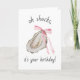Cette carte d'anniversaire présente un portrait aquarelle d'une huître décorée d'un arc rose.
