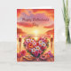 Carte postale romantique à thème hawaïen pour la Saint-Valentin. L'image présente une belle plage hawaïenne au coucher du soleil, avec des teintes oranges et roses vibrantes dans le ciel. L'océan est calme et reflète les couleurs du coucher de soleil.