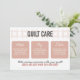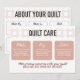 Une courtepointe est un travail d'amour, et devient souvent un héritier de famille. Lorsque vous offrez une courtepointe, utilisez cette carte pour aider le destinataire à apprendre à prendre soin de sa nouvelle courtepointe précieuse! Les courtepointes s'améliorent lorsqu'elles sont aimées, et cette carte encouragera votre destinataire à l'utiliser réellement. L'avant de la carte indique comment laver, sécher et ranger leur nouvelle courtepointe. L'arrière de la carte permet au fabricant d'écrire des informations importantes sur la courtepointe : par qui elle est faite, par où elle est faite, quand elle a été faite, avec quel motif elle a été faite, les détails de la courtepointe et les détails du matériau.
