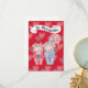 Ce couple adorable savoure sa friandise préférée... un chocolat chaud et un bonbon de menthe poivrée. L'arrière - plan est rouge avec un motif de coeurs doux, rouges et bleus.