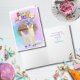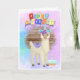 Carte d'anniversaire adorable avec un lama coloré travaillant pour être un llamacorn (remarquez le bandeau), et un gâteau d'anniversaire. Dans le message : "Espérons que votre anniversaire soit aussi magique qu'un llamacorn."