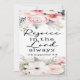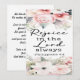 Une belle carte florale avec "Rejoice in the Lord Always" Philippiens 4:4 "Que ce soit un rappel doux : Peu importe la saison, le Seigneur est proche. Même dans les procès, il y a de la joie à trouver en Sa présence. Que votre coeur soit levé, votre esprit rafraîchi, et votre âme ancrée dans la joie que seul Lui donne. Prenez une profonde inspiration. Souriez. Dieu est toujours bon. Et c’est toujours une raison de se réjouir." est la citation au verso de cette carte plate.