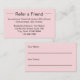 Cette carte de référence rose pâle a un modèle texte que vous pouvez modifier pour promouvoir votre entreprise. Comme il est indiqué, il dit Référer un ami à l'avant. Ensuite, il y a du texte pour montrer les termes de votre offre, votre nom, titre, adresse et numéro de téléphone. Le dos a des lignes pour que votre client écrive son nom et pour que son ami écrive son nom.
