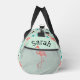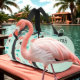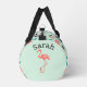Style du milieu du siècle avec flamants roses, rectangles aléatoires et atomes dans une palette de temps appropriée de rose, turquoise et marron. Arrière - plan est vert menthe. Votre nom sur les extrémités au-dessus d'un seul flamant.