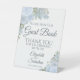 Ce magnifique panneau de piédestal fera invitation vos invités mariages à signer votre livre d'or. Décoré de fleurs boho rustiques avec des roses d'aquarelle peints à la main et des fleurs dans les tons bleu poussiéreux et vert sauge. Il y a de la place pour les noms du couple ainsi que la date du mariage.