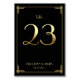 Cartes de numéro de table du mariage Great Gatsby Art Déco avec numéro d'or 23 et texte personnalisable, où vous pouvez ajouter vos noms et date de mariage, imprimé sur arrière - plan noir