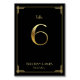 Cartes de numéro de table du mariage Great Gatsby Art Déco avec numéro d'or 6 et texte personnalisable, où vous pouvez ajouter vos noms et la date du mariage, imprimé sur arrière - plan noir