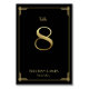 Cartes de numéro de table du mariage Great Gatsby Art Déco avec numéro d'or 8 et texte personnalisable, où vous pouvez ajouter vos noms et date de mariage, imprimé sur arrière - plan noir