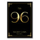 Cartes de numéro de table du mariage Great Gatsby Art Déco avec numéro d'or 96 et texte modifiable, où vous pouvez ajouter vos noms et date de mariage, imprimé sur arrière - plan noir
