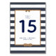 La conception moderne de l'événement nautique / numéro de table mariage de Nautical Boutique Co. comprend une corde attachée à un noeud à l'infini et une typographie de bloc traditionnelle associée à une typographie manuscrite moderne. Le design est mis sur un arrière - plan d'aquarelle assorti aux rayures bleu marine et blanc. #Nautique #MariageCôtier #Mariage #MariagePlage