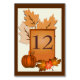 Apportez à l'extérieur avec cette carte de numéro de table de mariage thématique automne faite en brun et crème riche. Des graphiques de feuilles de couleur automne en rouille, orange et marron, et un citrouille décorent une zone de texte couleur rouille dorée, au milieu. Personnalisez le numéro brun rougeâtre foncé, pour chaque table de votre réception.