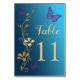 Cette carte de numéro de table à mariage floral bleu et or turquoise recto verso comporte des papillons violets.