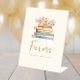 Express votre gratitude avec notre panneau "Favor" de la collection "Fleur sauvage et livres". Ce panneau présente les illustrations élégantes et peintes à la main de livres et de fleurs sauvages, dans des teintes apaisantes de rose, bleu, vert et or. Conçu avec une police de machine à écrire vintage rétro et un script doré branché sur fond d'ivoire, ce panneau ajoute une touche raffinée à votre table de faveur, superbement coordonnée avec le thème général de votre douche nuptiale.