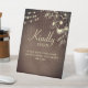 Élégant panneau de livres d'hôtes en bois rustique avec lumières à cordes et illustration vintage de fleurs d'or. Parfait pour la décoration des tables de réception.
