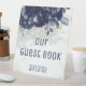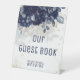 Un bouquet floral bleu marine moderne et élégant avec son ombre douce sur ce panneau de mariage personnalisable avec des éclaboussures et des éléments dorés brillants, avec vos prénoms et le mot Mariage en dessous dans une police moderne.