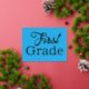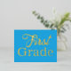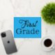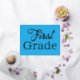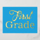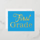 Bienvenue en première année, carte postale de l'enseignant. Customisez le texte pour n'importe quel grade, qui est imprimé en lettres de papier. Le gros libellé couvre la jolie carte bleue en or, argent ou feuille d'or rose annonce l'année prochaine de l'école. Sur le dos, l'enseignant peut créer un message personnalisé à envoyer à ses élèves en bleu, en caractères imprimés. Inclure des informations sur la salle de classe, le jour et l'heure où commence l'école, ou tout ce que l'enfant et les parents peuvent apprécier.