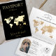 Cette belle faire-part de mariage moderne est conçue pour ressembler à un passeport, avec une carte du monde en feuille d'or en première page. Le design inspiré du passeport est parfait pour un mariage de destination, un mariage tropical de plage ou un mariage à thème d'aventure. Cette invitation est parfaite pour les couples qui veulent donner à leur mariage une touche unique et mémorable.