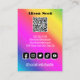 Bijoux Carte d'affichage avec une mise à jour de l'arc-en-ciel de néon brillant. Ce collier de bijoux et carte d'oreille a un style et une typographie modernes, des couleurs vives pour vous faire remarquer, un code qr pour vos clients et clients pour facilement scanner et accéder à votre site Web, et des icônes de médias sociaux qui sont amovibles. Il y a d'autres icônes d'application de médias sociaux cachées dans le calque extérieur que vous pouvez remplacer ou ajouter aux icônes affichées - il suffit de cliquer sur le bouton "personnaliser" puis modifier dans l'outil de conception pour customiser avec les icônes sociales appropriées. Avant de la carte a coupé des lignes de guide et des points pour le collier et l'affichage de l'oreille. N'oubliez pas de consulter les objets correspondants de la collection !