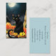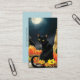 Un chat noir est assis à la porte avec des citrouilles, une lanterne, un balai, des feuilles d'automne et une pleine lune de récolte derrière